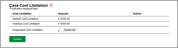 In the Requested Cost Limitation field overtype the default cost limit that CCMS offers with 25000.00 and click Confirm.