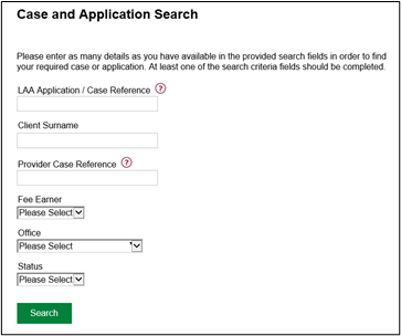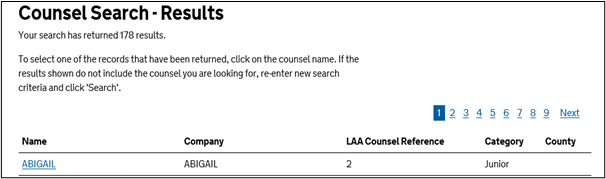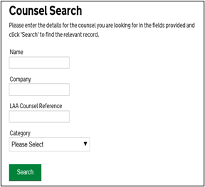NOTE: In the Counsel Search screen you can search by using Name, Company, LAA Counsel Reference and Category.