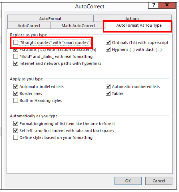 - Under the Replace as you type section untick the “Straight quotes” with “smart quotes” check box.