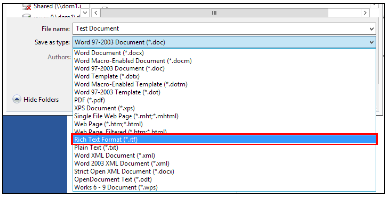 - In the Save as type drop down box select Rich Text Format (*.rtf)