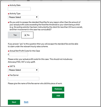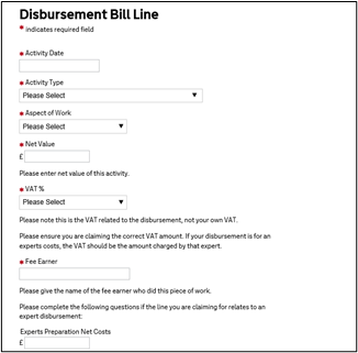 Enter the details of the bill line. Use the drop-down list to select the relevant activity.