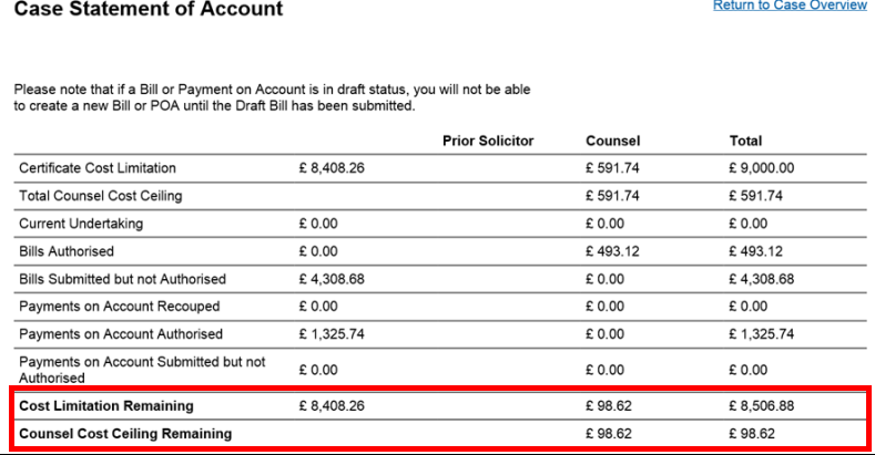 In the above example, counsel has been allocated £591.74, but has been authorised payment of £493.12. This has left £98.12 for counsel. Before the bill is submitted, an amendment request to reduce counsel’s costs allocation to £493.12 should be submitted if there are no further bills to be submitted from counsel.