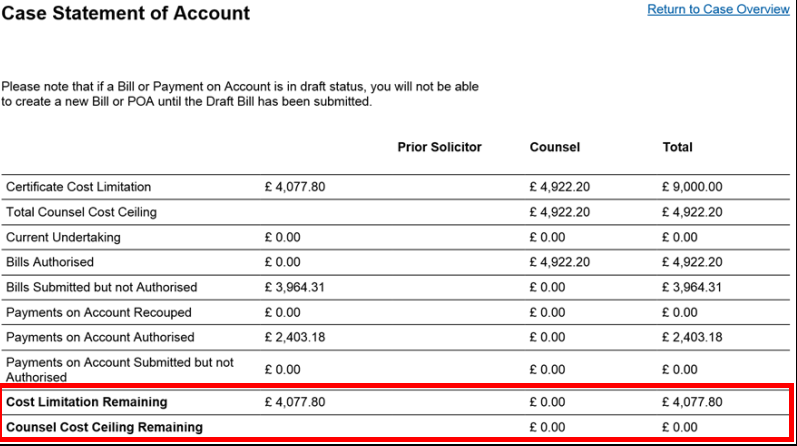 Any costs allocated to counsel to claim under the Family Advocacy Scheme (FAS) must match the final amount claimed by counsel. You can check how much costs remain allocated to counsel prior to submitting the claim on the Case Statement of Account screen. The Total Counsel Cost Ceiling line will show the full amount allocated to counsel. The Counsel Cost Ceiling Remaining line will show the amount of costs remaining on counsel’s costs limit. It should read £0.00.