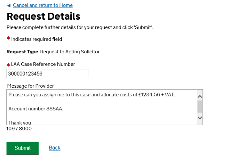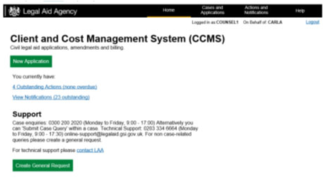 NOTE: Once the provider has assigned counsel, a notification will be sent via CCMS. If CCMS does not recognise the case reference number provided the request will be returned to you with the message ‘Unable to send message to conducting solicitor’.