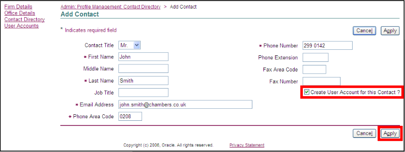 In the Add Contact screen, enter the required information (indicated by an asterisk). Ensure that you tick the Create User Account for this Contact? box before clicking Apply.