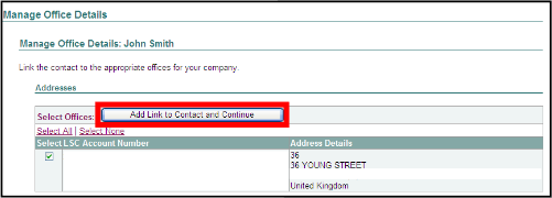 You will proceed to the Manage Office Details screen. Tick the box next to the legal aid supplier number to link the contact to counsel and then click Add Link to Contact and Continue.