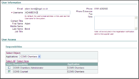 Responsibilities displays the available CCMS User Roles. Click the tick box to select the relevant CCMS Role(s) for the user to apply their role.