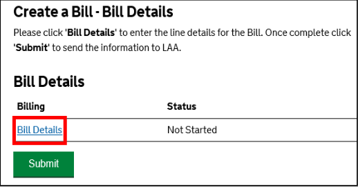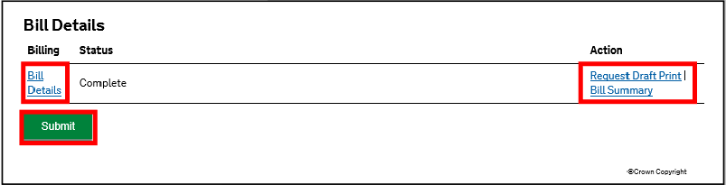 To access additional options before submission, click Bill Details to amend bill details, click Bill Summary to view a summary of the bill.