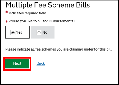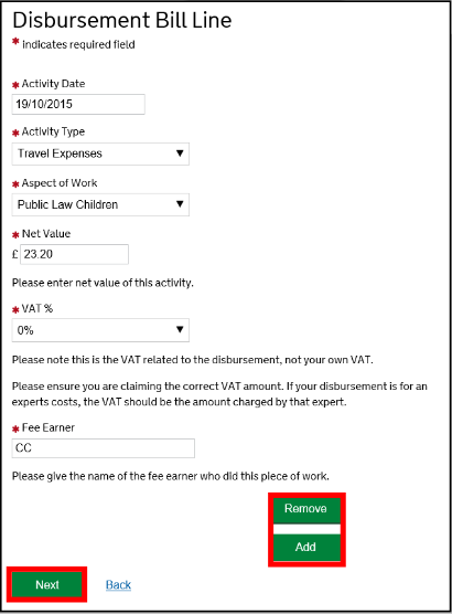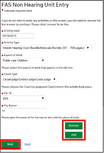 This screen can be used to add any court bundles authorised by the court and claim the exceptional travel fee. A similar screen will be presented if billing