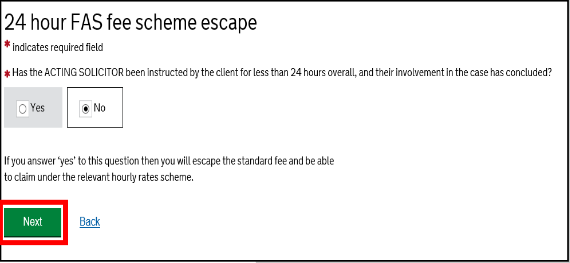 Confirm if this is a FAS 24 hour escape case, then click Next.