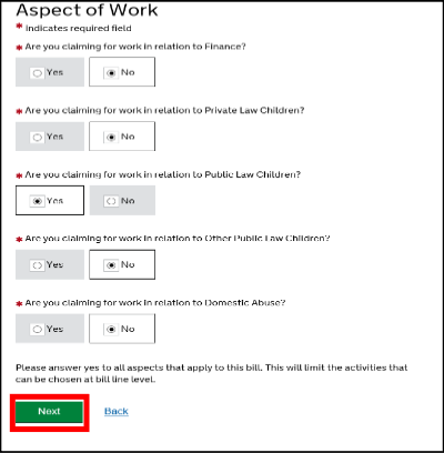 - A provider or advocate entering a claim for an aspect of work not included in the scope of the certificate will receive an error message confirming that they have selected one or more categories of work that does not match any of the proceedings granted in this case.