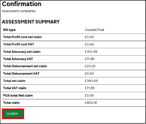The Assessment Summary screen is shown. Click Confirm to continue.