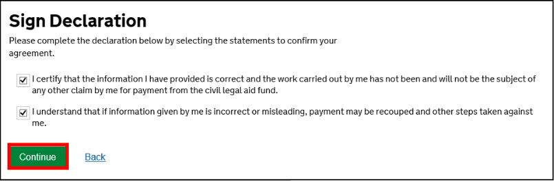 The Sign Declaration screen is then shown. Tick both check boxes and click Continue to submit the bill.