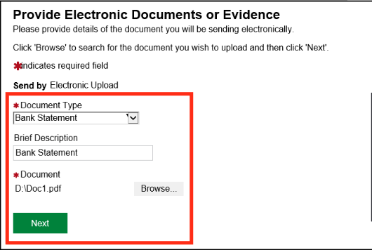 You will receive a Document Required action in your actions and notifications. The easiest way to submit evidence is electronically and the maximum file size is 8MB.