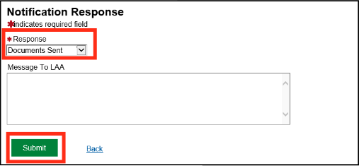 From the Case Notification screen, scroll to the bottom and select a response of Documents Sent.