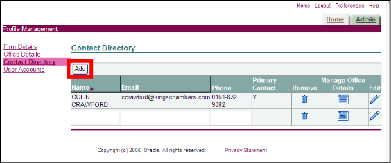 NOTE: Each counsel will have been set up as a contact under their own name automatically, so there will be at least one contact visible in the directory.