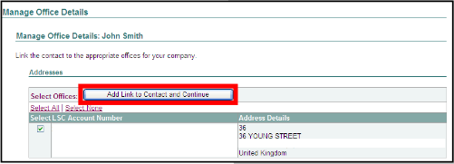 You will proceed to the Manage Office Details screen. Tick the box next to the legal aid supplier number to link the contact to counsel and then click Add Link to Contact and Continue.