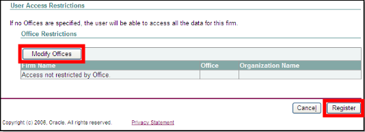 Under Office Restrictions click Modify Offices to open the Modify offices screen. Select the account number by ticking the box, then click Apply. This will ensure the user you are setting up can access the account. You will be returned to the main user registration screen. Scroll down to the bottom of the screen and click Register.