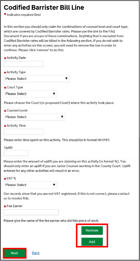 Use the Add button to enter more bill lines. Click Next to continue to appeal bill.