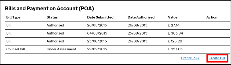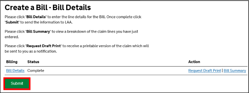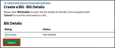 Once the bill is completed CCMS will return to the Bill Details section. Now that the bill is completed it can be submitted to the LAA for assessment.