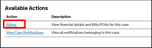 Scroll down the Case Overview screen to the Available Actions and click Billing.
