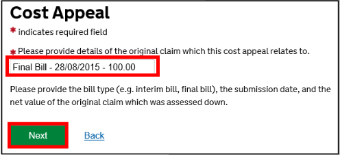 NOTE: A Documents Required action will be sent to the user that pressed the submit button shown above. Any evidence requested must be provided before the LAA can process the appeal bill.