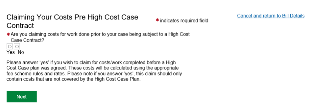 The page for ‘Claiming Your Costs Pre High Cost Cases Contract’ should be answered No to activate ‘Events’.