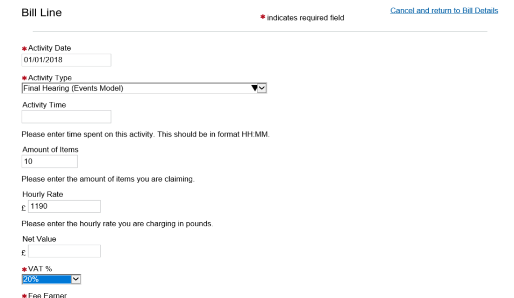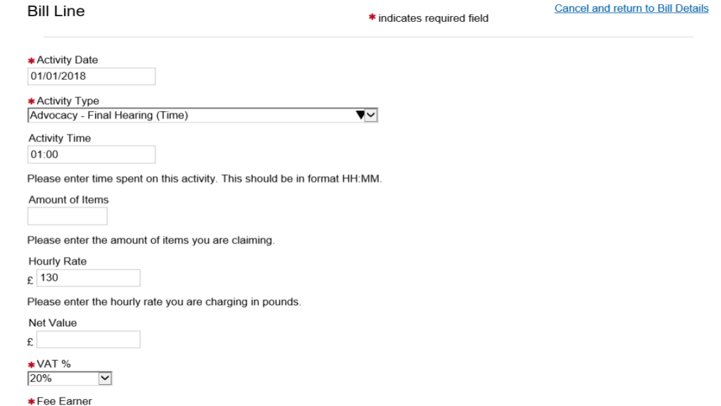 Not all fields need to be completed in the Bill Line screen. Units and Hourly rate, Hourly rate and Time or Net Only need to be completed. Other fields can be left blank.