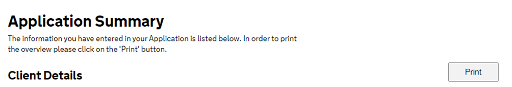 Select Complete Application, which will take you to the Application Summary screen. Review the details provided and select Back at the bottom of the screen if you identify any entries which need amending. If the details provided are correct you should select the Print option to access a copy of the Application Summary. Your client will be required to sign the printed version of the summary, which should be retained on file for auditing purposes.