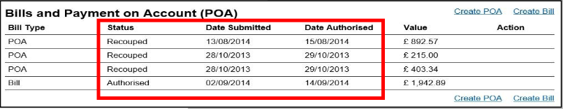 You will be able to see the status of each bill, the date you have submitted, and the date authorised by the LAA. The Bill Status could show as draft, submitted, under assessment, authorised, rejected or recouped.