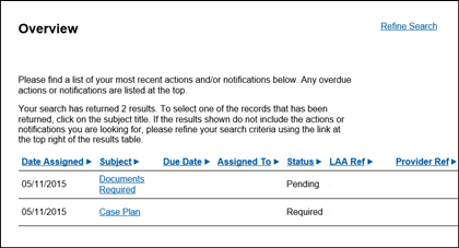 Once a provider has submitted the case enquiry, the LAA will send a case plan action. Click on the Case Plan link to access it.