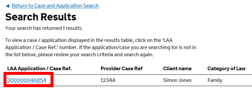 Select the appropriate case from the search results by clicking the LAA Application / Case Reference number.