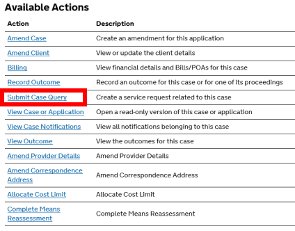 From the list of Available Actions select Submit Case Query.