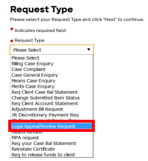 From the drop-down menu select Legal Appeal Review Request and then click Next.
