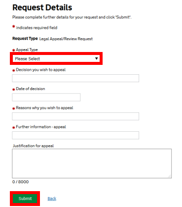 On the Request Details page select reason for the ‘Appeal Type’ from the drop-down menu. Then complete each section marked with the *.