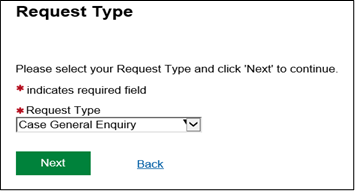 NOTE: In this guide a Case General Enquiry has been chosen but many other request types are available.
