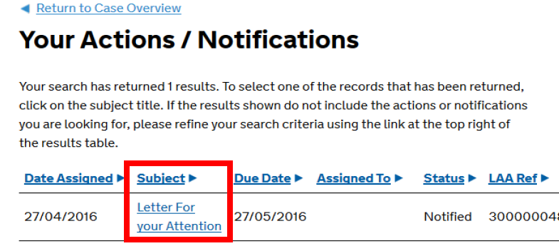 To access the notification navigate to Actions and Notifications and click Letter for your Attention.