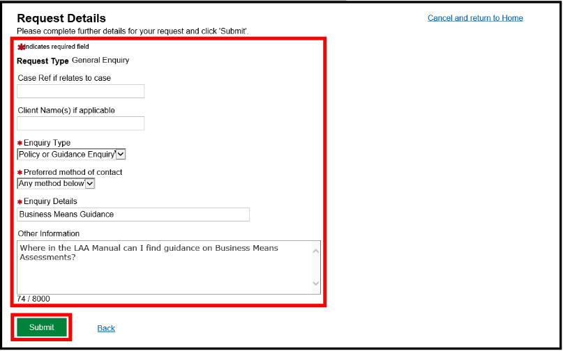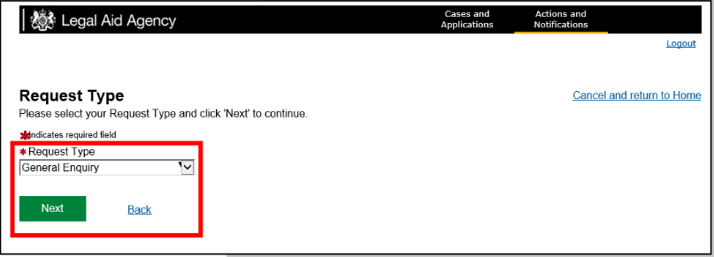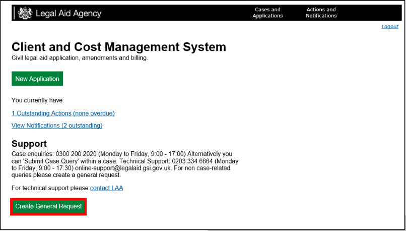 Click Create General Request to send the LAA a non-case/non-application relate query.