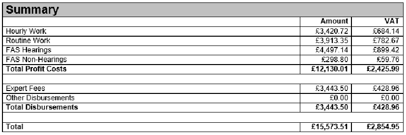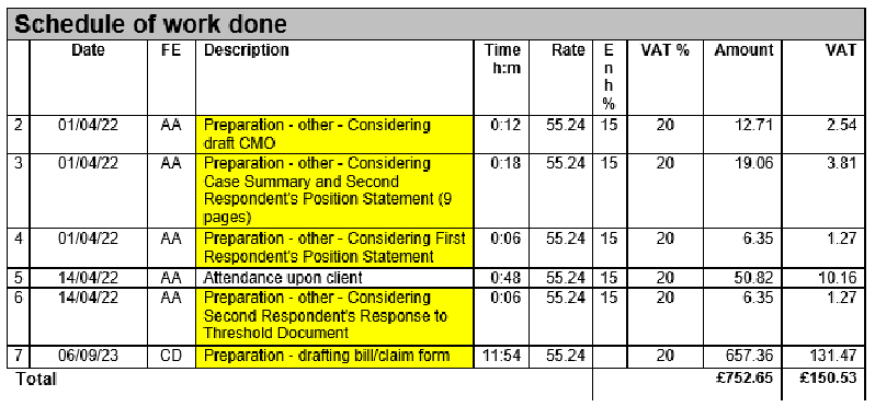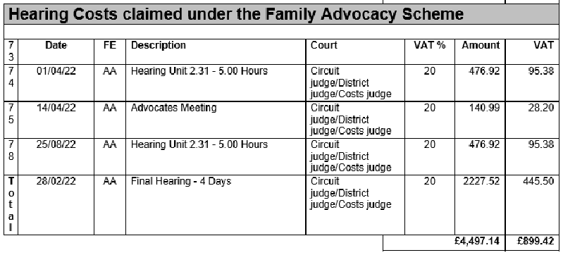 - a description of the work, such as Hearing unit 2.31 – 5.00 hours, and Advocate meeting