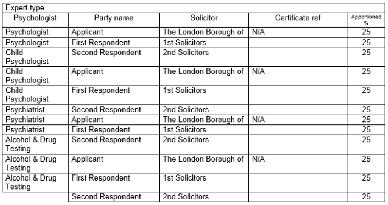 NOTE: Where there is a joint instruction of an expert, you must list all other parties to the proceedings and the apportioned percentage share of the experts’ costs (if a party is not responsible for a share of the expert costs, then list and enter 0% as their share).