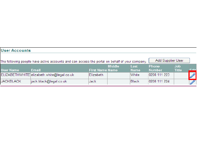 - User Accounts will display all the existing CCMS Users within your firm. Click on the Pencil icon in the Edit column to amend that users CCMS roles.