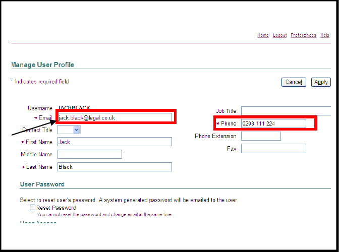 - The Manage User Profile screen will allow you to make changes to the user which includes change of email address, contact details and name.