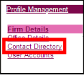 Contact Directory displays all existing contacts under your account. Your firm is set up with one contact automatically, so there will be at least one contact visible in the directory. This is usually your Firm Administrator.