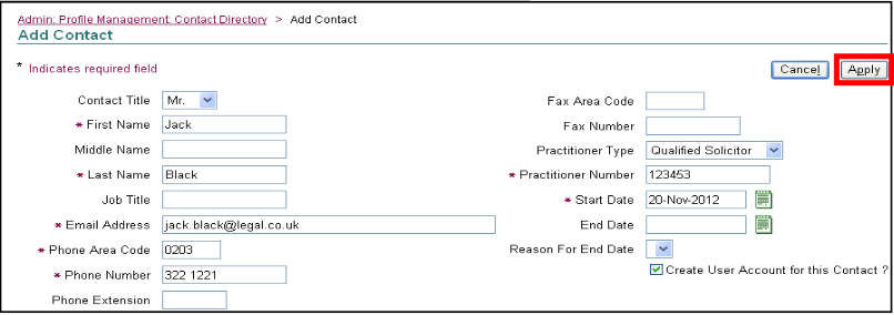 Choose Qualified Solicitor from the drop-down list. Fill out the mandatory fields that now appear below Practitioner Type. The Start Date will be today’s date. Click Apply to save the contact.