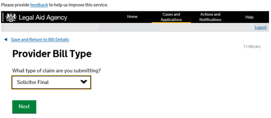 Ensure you have the option for ‘Solicitor Final’. If you do not, check the Outcome task has been submitted for every proceeding on the certificate.