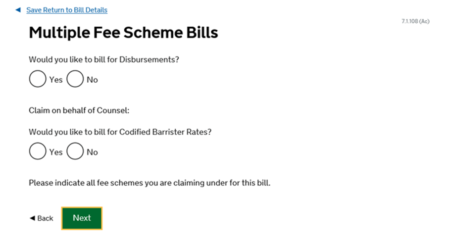 You will then reach the below question. You should indicate ‘Yes’ where you are billing on behalf of any counsel in the second question and ‘Yes’ to the first question if you have any disbursements to claim.