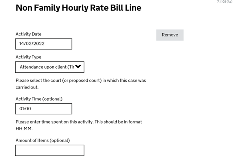 NOTE: CCMS will generate the correct rate from the rules base, therefore you only need to confirm either the hourly rate, enhancement, and VAT or the number of items (such as letters), enhancement, and VAT.