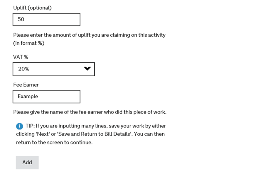 You should enter each line of work undertaken from your file, for example, 1 hour of attendance on the client, clicking ‘Add’ after each one.