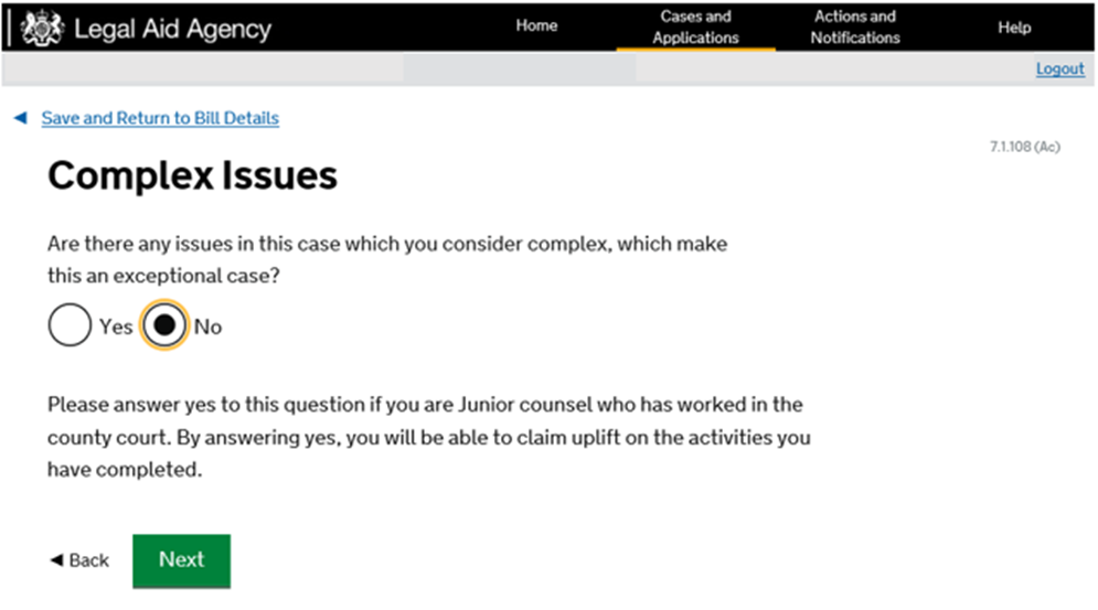 Billing on behalf of Counsel will initially ask if Counsel will be claiming enhancement (only if they are Junior Counsel in the County Court) on their costs. You should reply accordingly and move on to the next screen.
