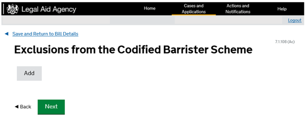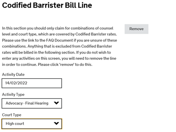 Codified Barrister Rates screen. If you are not claiming within the Codified Rates Scheme for counsel, click ‘Remove’ at the bottom of this page and go to the ‘Exclusions from Codified Rates’ screen. This will be where there is no combination of counsel and court which falls under the Codified Rates.